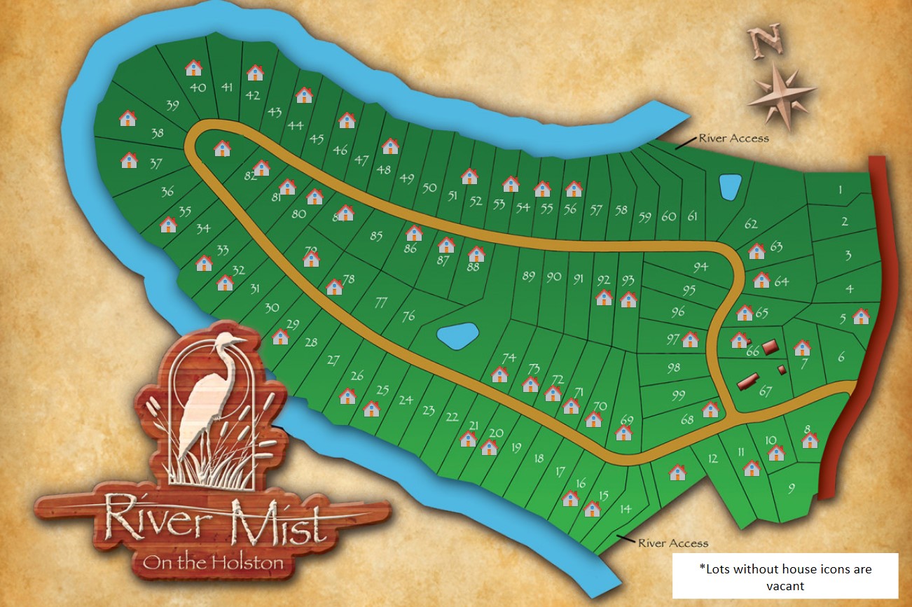 The River Mist community is conveniently located near Knoxville, Jefferson City, and Morristown. It offers the feel of a private community and is located just far enough from the major cities that you feel secluded, yet still close enough that you can easily find your way to downtown shopping. The residents of River Mist are able to enjoy everything that the larger cities have to offer with a simple drive that only takes a few minutes.